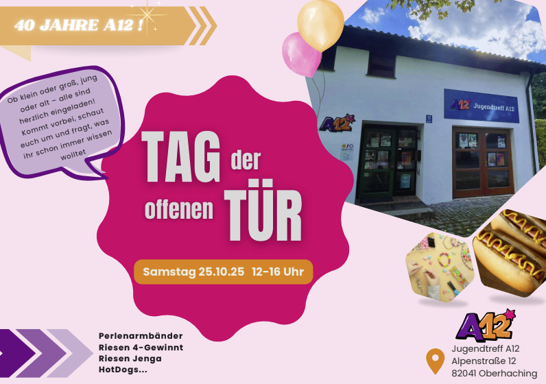 Die A12 feiert 40 jähriges Jubiläum – und das muss gefeiert werden! Deshalb öffnen wir diesen Samstag, den 25.10., von 12 bis 16 Uhr unsere Türen für Familien, Jugendliche, Großeltern und Interessierte, um unsere Räume und Angebote vorzustellen. Neben spannenden Einblicken in die Arbeit der A12 gibt es Hotdogs, die Möglichkeit Perlenarmbänder zu gestalten, und natürlich kann die A12 ausgiebig bespielt und entdeckt werden.