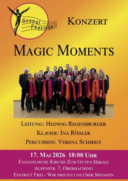 Sonntag | 17. Mai | 18 Uhr | Kirche Zum Guten Hirten Konzert „Magic Moments“ der GospelFeelings. Die GospelFeelings laden im Mai wieder zu ihrem Jahreskonzert ein und versprechen nichts geringeres als echte „Magic Moments“. Auf dem Programm stehen Gospels, afrikanische Songs und internationale Pop-Hits von Coldplay bis Bob Dylan –und sogar Pat Benatar schaut musikalisch vorbei. Auch Glaubens- und Liebeslieder sind dabei, damit nicht nur die Stimmen, sondern vielleicht auch ein paar Tränchen glitzern dürfen.