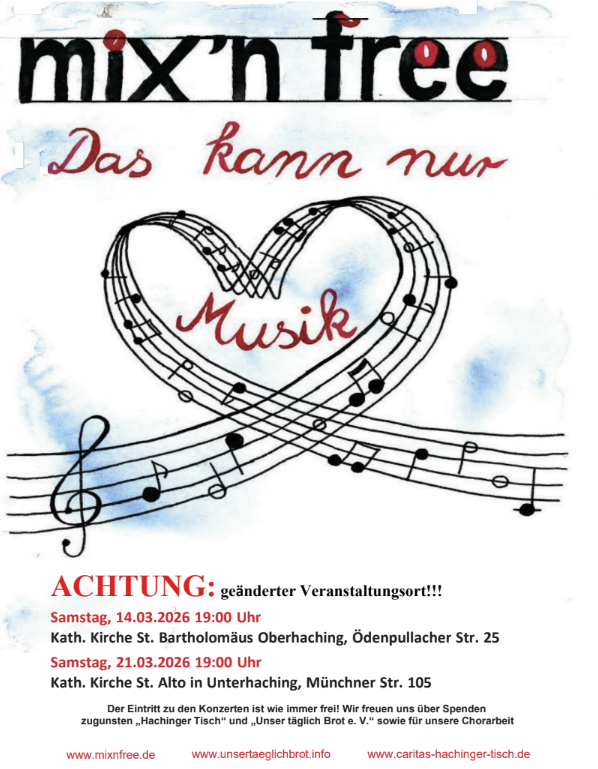 Es ist wieder soweit: mix´n free, der ökumenische Chor mit eigener Note und sozialem Engagement, lädt zu seinen Konzerten im März 2026 ein! Freuen Sie sich auf Jazz und Blues, Musicals, Afrikanisches, Popsongs, eigene Arrangements und mystische Klänge – und wie immer darf der Spaßfaktor zum Mitsingen und Zuhören nicht zu kurz kommen! Ganz herzlichen Dank an alle Konzertbesucherinnen und -besucher für Ihre großzügigen Spenden anlässlich unserer letztjährigen Benefiz-Jubiläumskonzerte: der Reinerlös von 4.576,70 € wurde dem Verein „Unser täglich Brot e. V.“ zur Verfügung gestellt, der Kinder aus benachteiligten Familien im Hachinger Tal unterstützt. Hören und erleben Sie, was Musik alles kann, und besuchen Sie unsere nächsten Konzerte: Samstag, 14. März 2026, 19 Uhr: St. Bartholomäus Oberhaching, Ödenpullacher Str. 25 Samstag, 21. März 2026, 19 Uhr: St. Alto Unterhaching, Münchner Str. 105 Achtung: Veranstaltungsorte wurden getauscht! Der Eintritt zu den Konzerten ist wie immer frei! Wir freuen uns über Spenden zugunsten „Hachinger Tisch“ und „Unser täglich Brot e. V.“ sowie für unsere Chorarbeit mix'n free – Ökumenischer Chor, Leitung: Helga Schmetzer Piano: Waltraut Schneider, e-Gitarre: Susanne Graf www.mixnfree.de www.caritas-hachinger-tisch.de www.unsertaeglichbrot.info